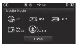 Im Media-Modus des Hyundai i40 (VF) können Fahrer bequem zwischen CD, USB, iPod, AUX, My Music und Bluetooth-Audio wechseln. Die Medienauswahl erfolgt über Tastendruck oder TUNE-Drehregler, während der Popup-Modus schnelle Navigation erleichtert.